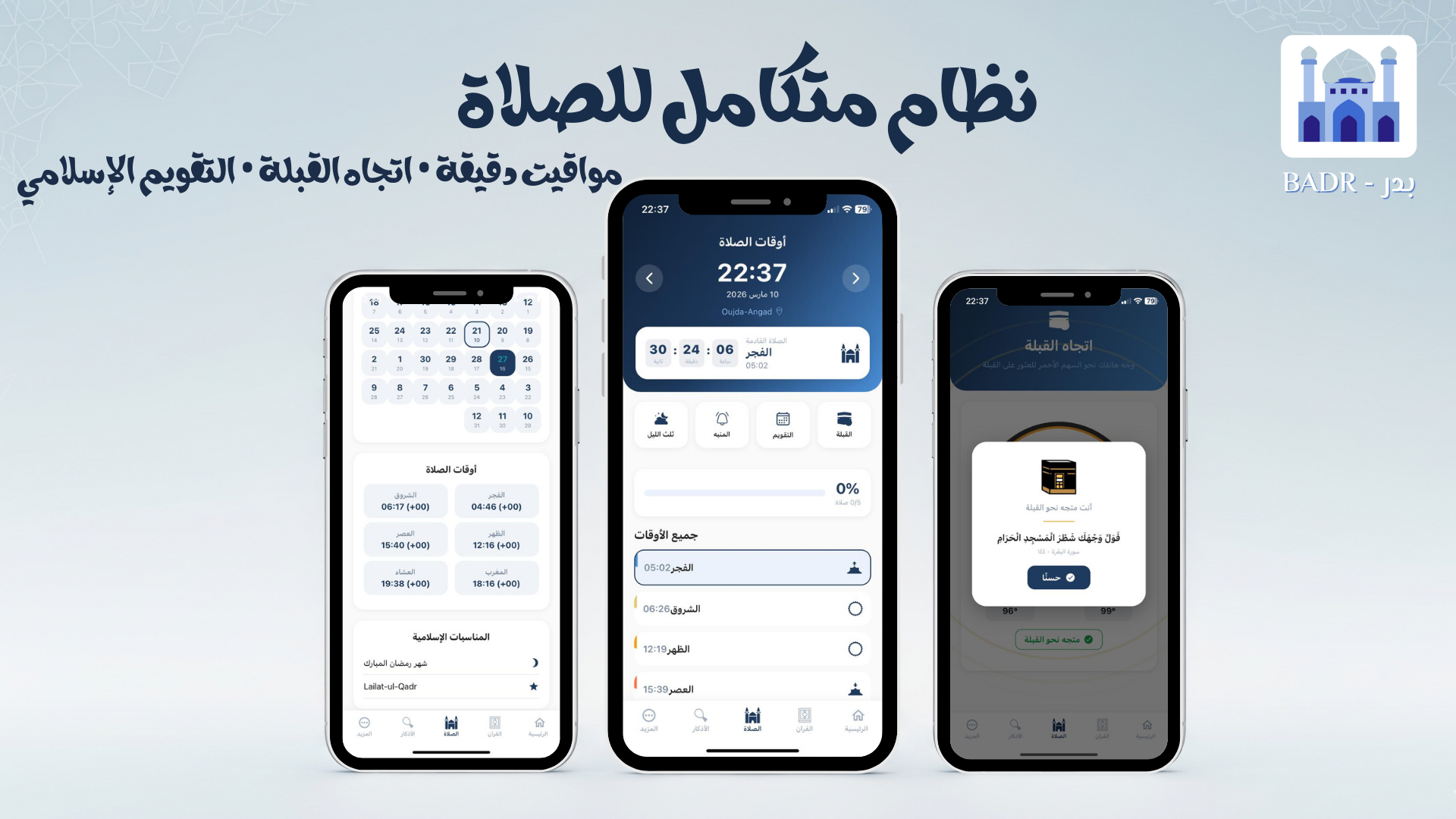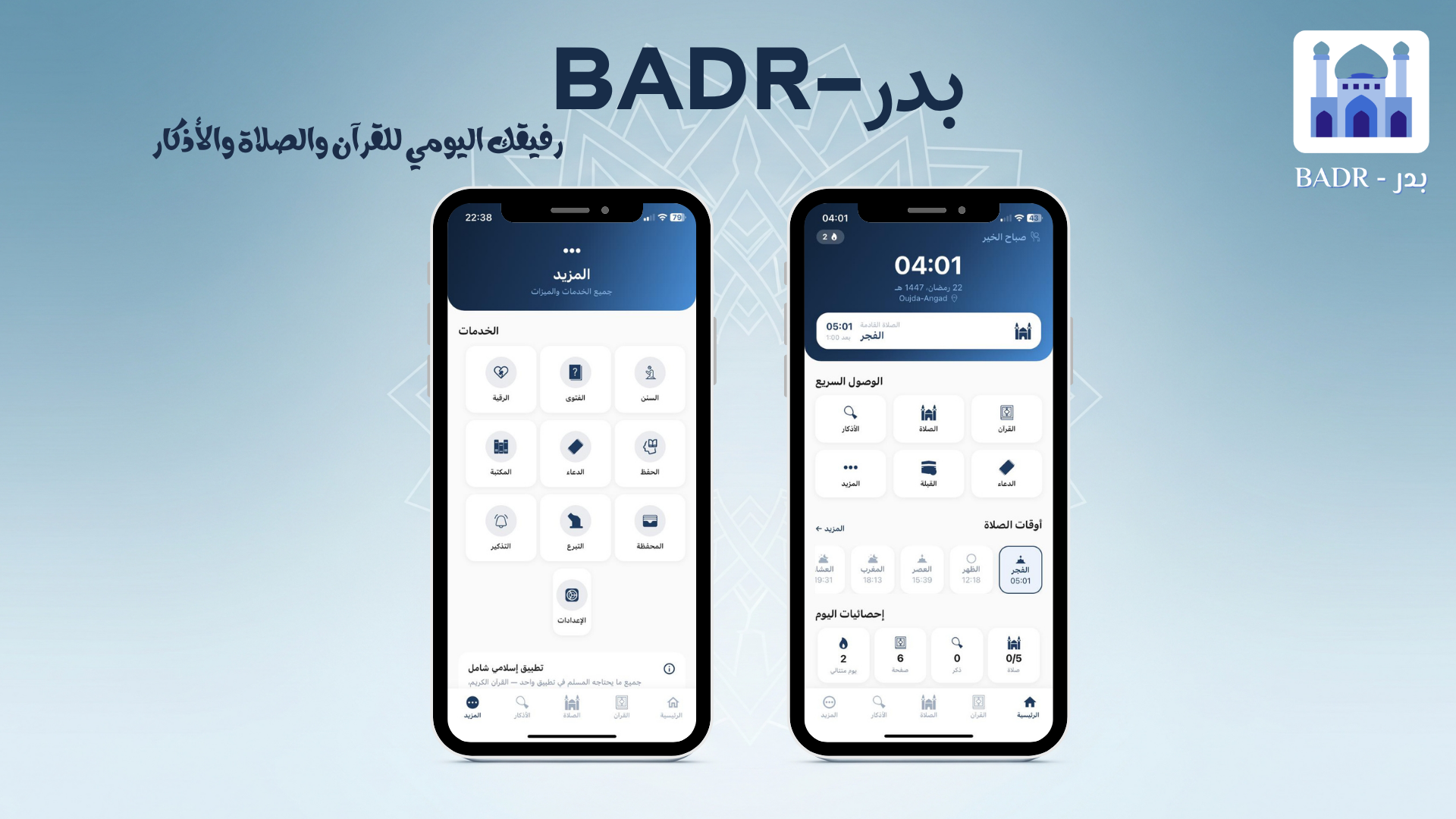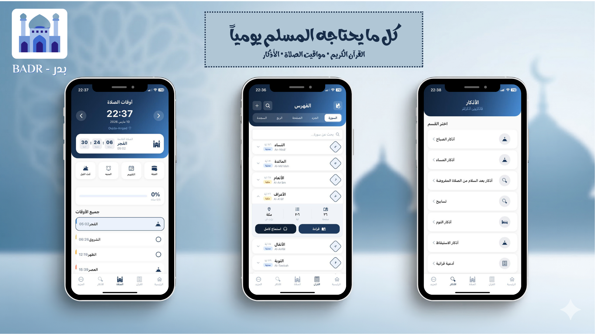 BADR is a comprehensive Islamic mobile application created from a meaningful vision: using technology to support Muslims in their daily spiritual life through a respectful, organized, and practical digital experience.