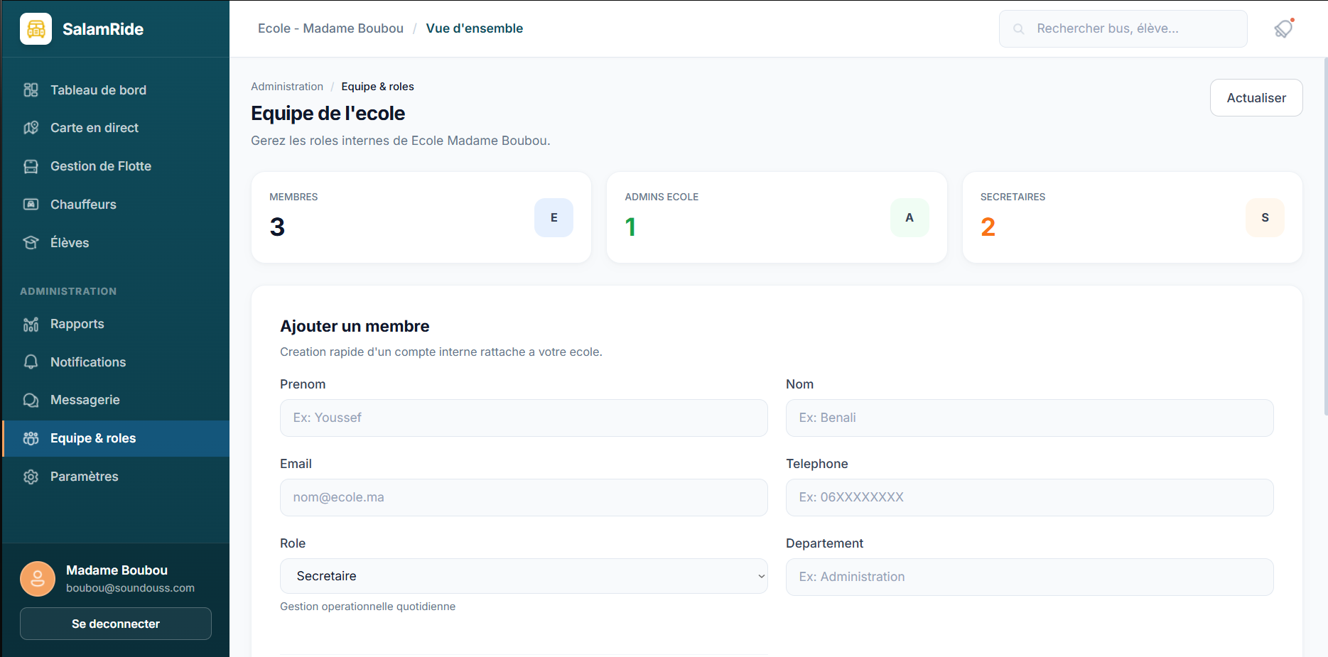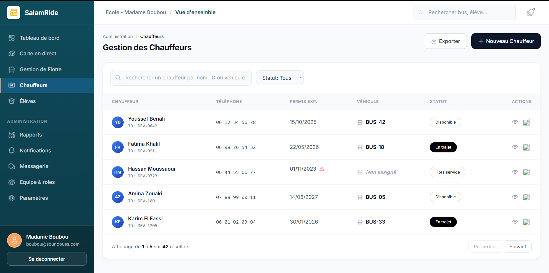 Parents can track the school bus in real time and receive notifications about departures, arrivals, delays, and incidents. Drivers are supported with optimized routes, student lists, and tools to report boarding and drop-off actions. Schools benefit from a complete management dashboard that centralizes buses, drivers, students, payments, alerts, and statistics.